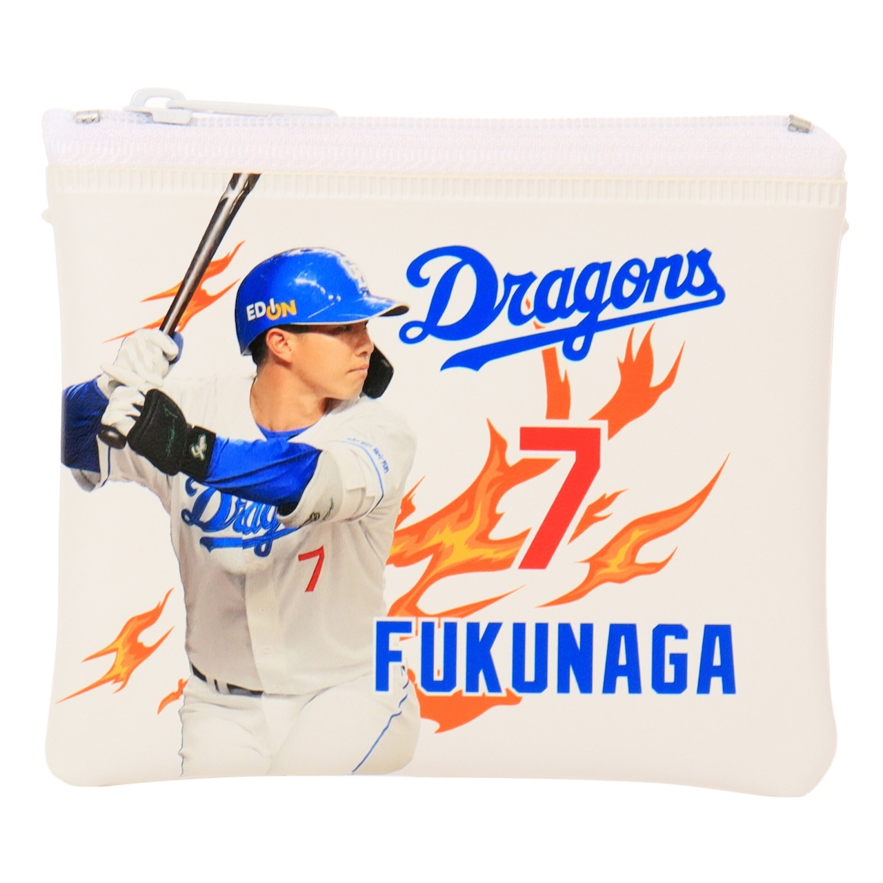 2025年シーズンに活躍する福永祐基選手の写真、背番号、名前を鮮やかにデザイン。ポーチの裏面には中日ドラゴンズのシーズンスローガン『どらポジ』が施されており、ファンの心をつかむアイテムに仕上がっています。