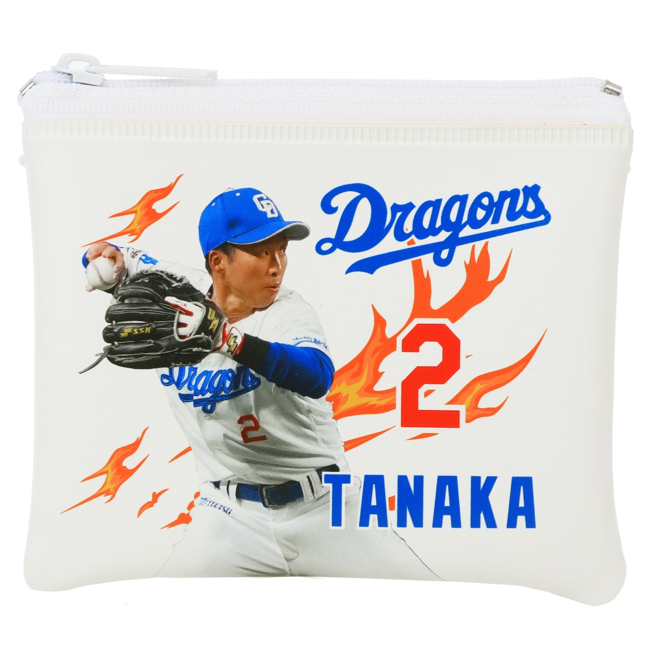 2025年シーズンに活躍する田中幹也選手の写真、背番号、名前が美しくデザインされています。ポーチの裏面には中日ドラゴンズのシーズンスローガン『どらポジ』が施されており、ファンにはたまらないアイテムに仕上がっています。