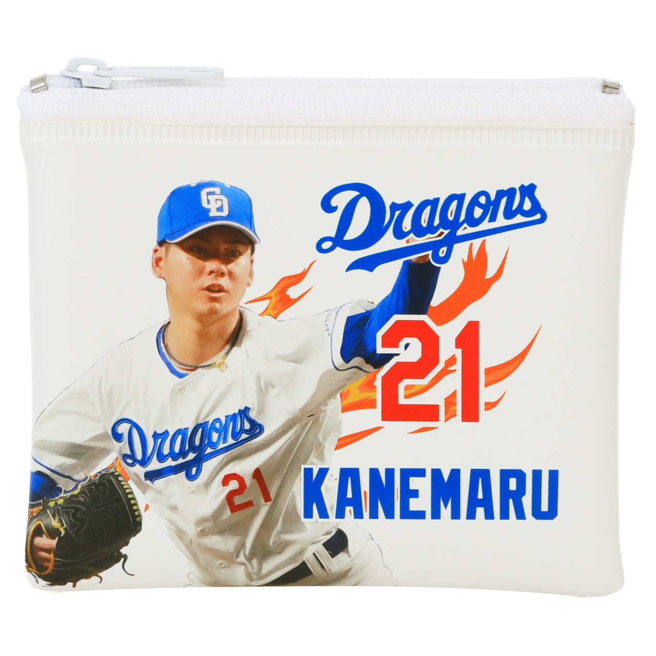 2025年シーズンに活躍する金丸夢斗選手の写真、背番号、名前が美しくデザインされています。ポーチの裏面には中日ドラゴンズのシーズンスローガン『どらポジ』が施されており、ファンにはたまらないアイテムに仕上がっています。