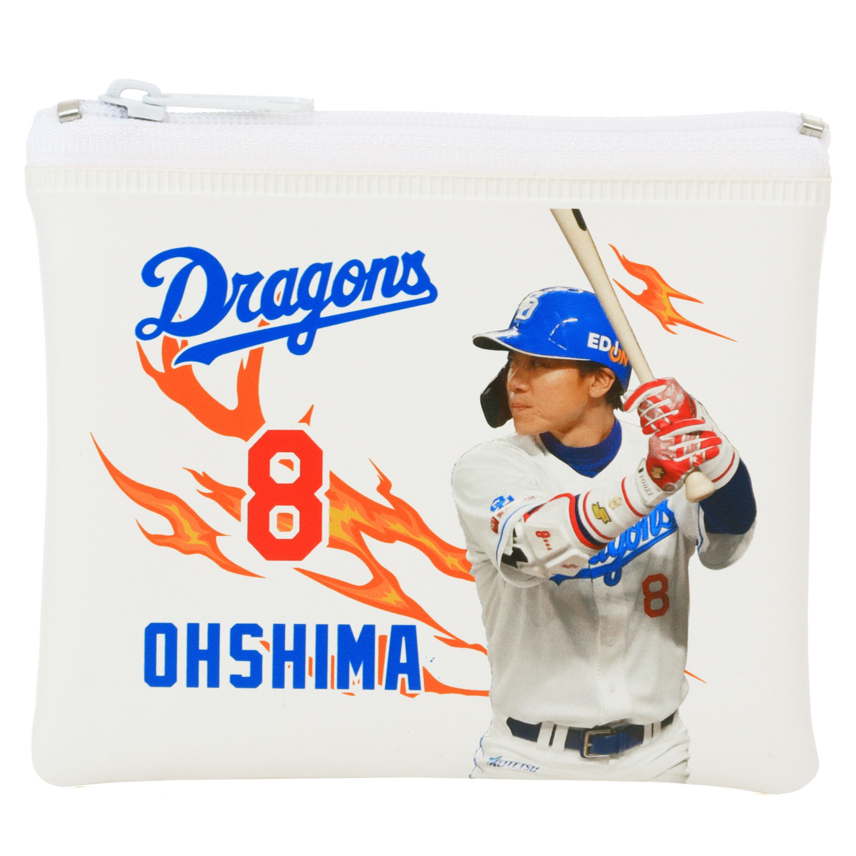 2025年シーズンに活躍する大島選手の写真、背番号、名前が美しくデザインされています。ポーチの裏面には中日ドラゴンズのシーズンスローガン『どらポジ』が施されており、ファンにはたまらないアイテムに仕上がっています。