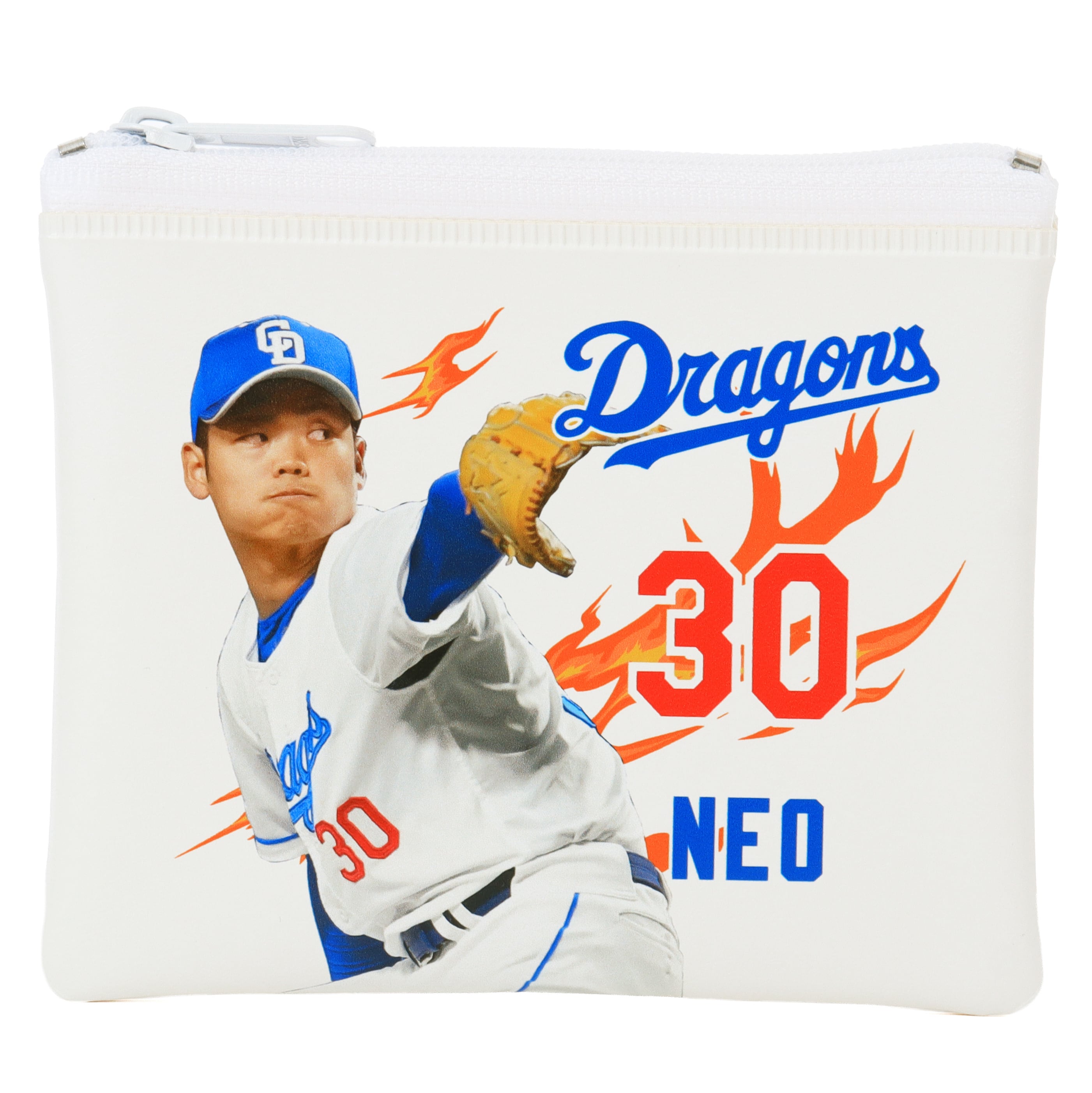 2025年シーズンに活躍する根尾選手の写真、背番号、名前が美しくデザインされています。ポーチの裏面には中日ドラゴンズのシーズンスローガン『どらポジ』が施されており、ファンにはたまらないアイテムに仕上がっています。