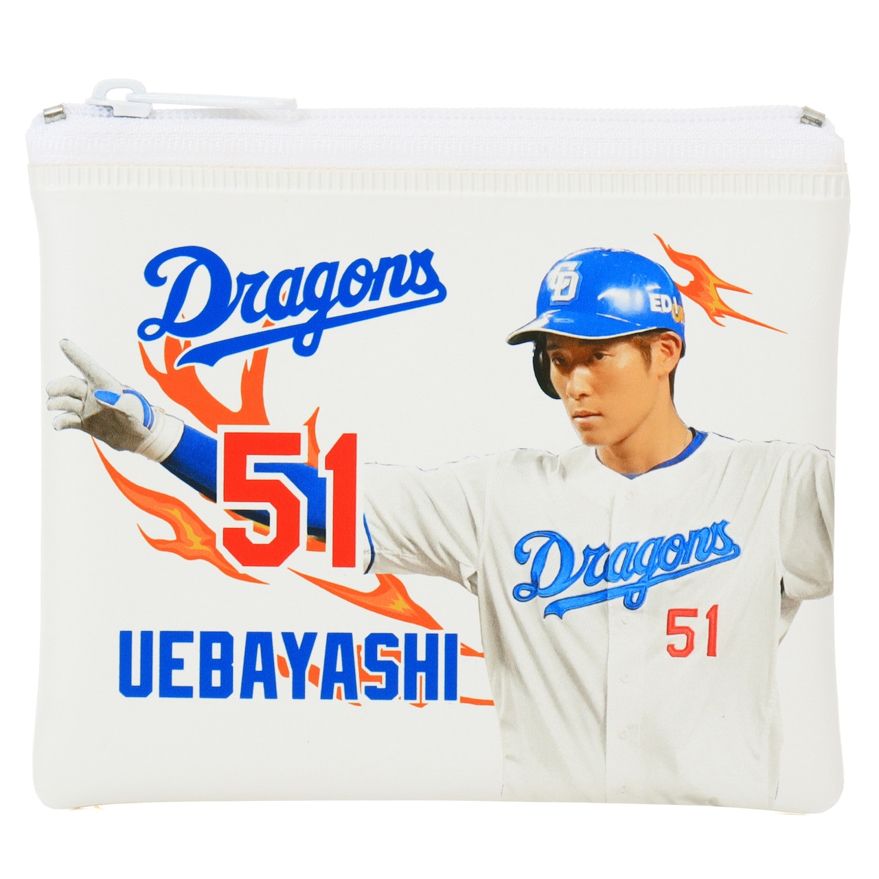 2025年シーズンに活躍する上林選手の写真、背番号、名前が美しくデザインされています。ポーチの裏面には中日ドラゴンズのシーズンスローガン『どらポジ』が施されており、ファンにはたまらないアイテムに仕上がっています。