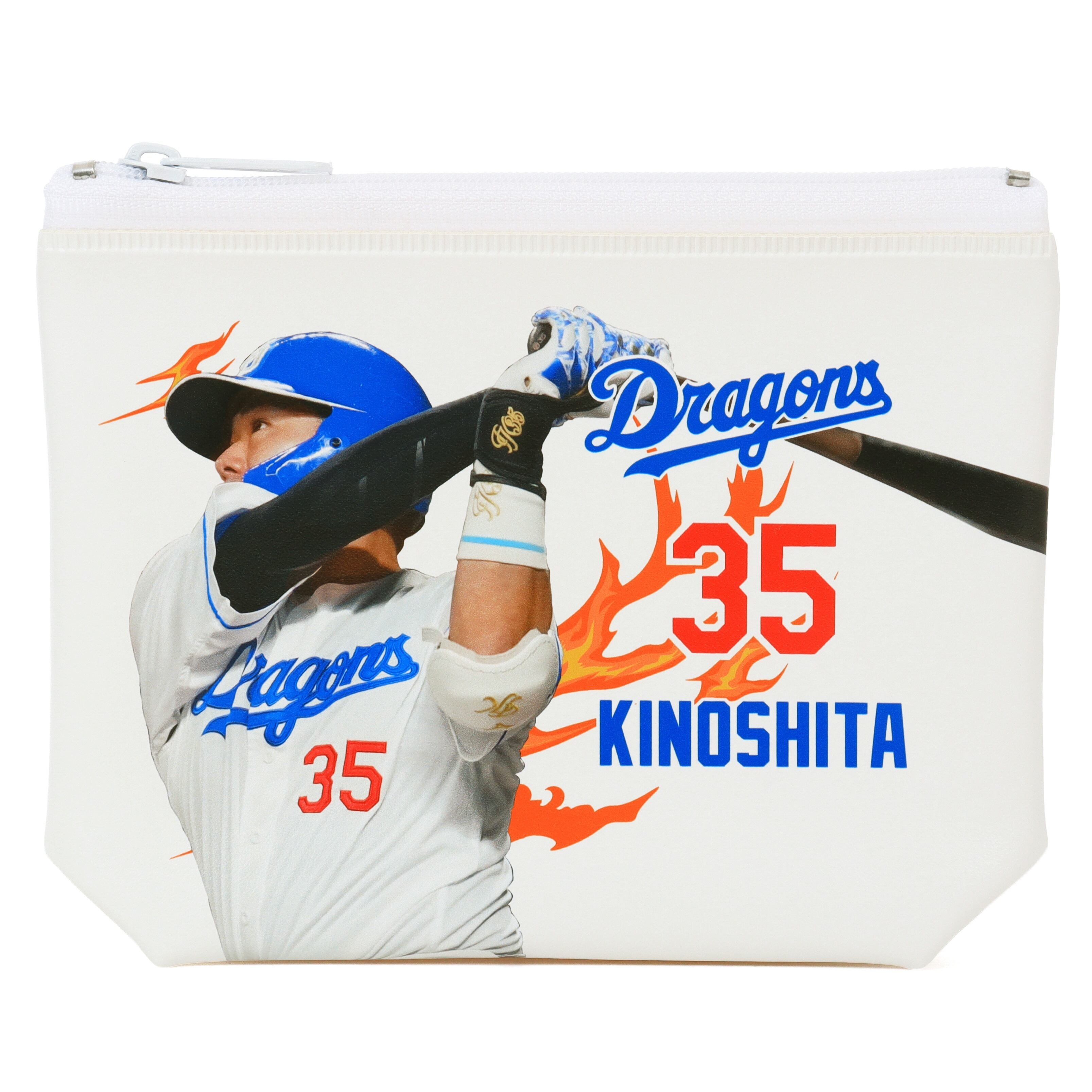 2025年シーズンに活躍する木下選手の写真、背番号【35】、名前が美しくデザインされています。ポーチの裏面には中日ドラゴンズのシーズンスローガン『どらポジ』が施されており、ファンにはたまらないアイテムに仕上がっています。