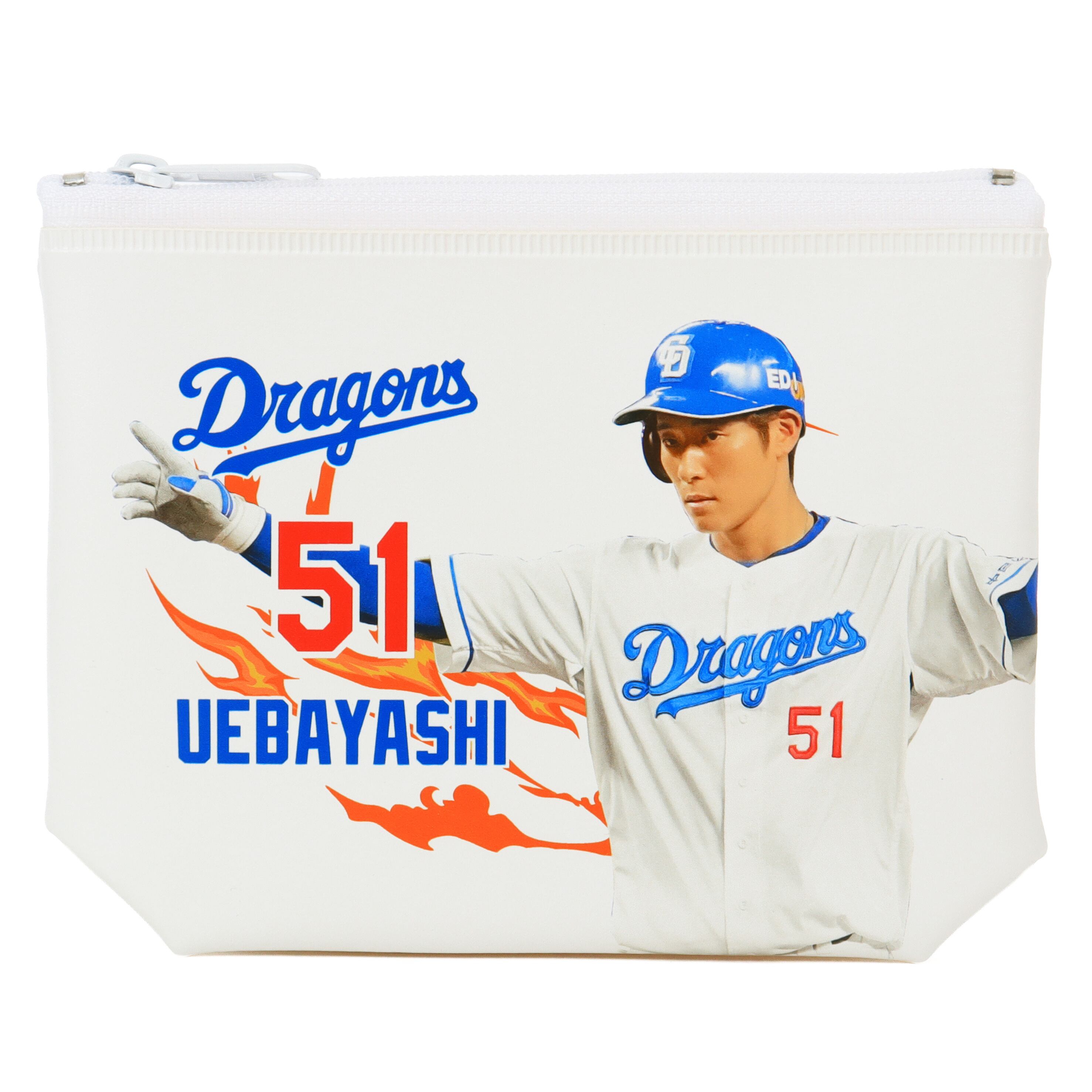 2025年シーズンに活躍する上林選手の写真、背番号【51】、名前が美しくデザインされています。ポーチの裏面には中日ドラゴンズのシーズンスローガン『どらポジ』が施されており、ファンにはたまらないアイテムに仕上がっています。